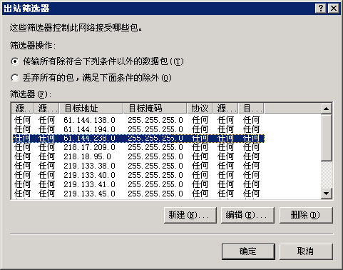 在路由的服务器上面设置静态筛选器(出站筛选器),丢弃所有QQ服务器IP的数据报即可,如下图: