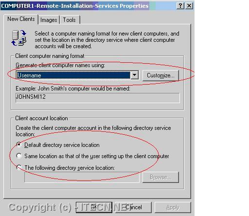 ( 2 ) 点击 advanced settings 按钮,可以进行远程安装服务器的设置,主要的设置有,加入到域中的计算机名如何确定,及存放的位置: