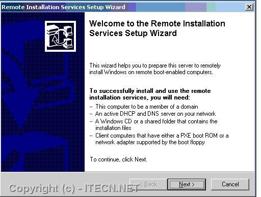 要求是一台 windows 2003/2000 服务器,安装了远程安装服务,至少有一个 NTFS 的非系统分区。空间要求至少 2G ,强烈建议在实验中应该划定超过 4G 的空间