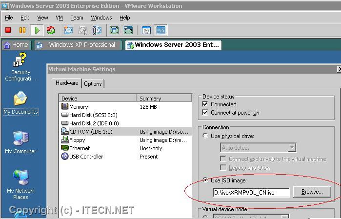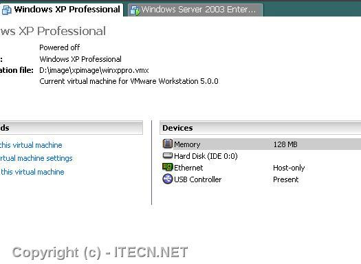 新建一台虚拟机,开 128M 内存, 4G 的硬盘,同时取消 CDROM 和 floppy 。(换言之该计算机只能通过网络来安装 windows xp )