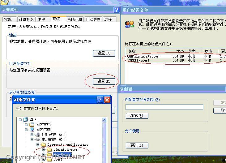 ( 2 )拷贝登录的域管理员的 profile 到 default user profile 。(这个过程,需要再创建一个本机管理员,然后以该管理员身份登录,拷贝域的 administrator 的 profile 到 all users 目录)。见下图: